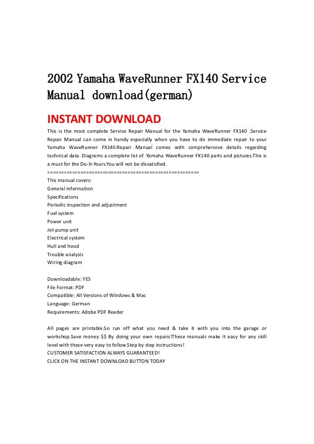 Yamaha WaveRunner FX140 2002 2003 2004 2005. Factory Service / Repair/ Workshop Manual Instant Download! -Years 02 03 04 05. Shop our large selection of 2002 Yamaha FX140 (FX1000A) OEM Parts, original equipment manufacturer parts and more online or call at 908-483-5329. Yamaha waverunner fx140 parts catalog manual fx1000-a/c-a (f1b1/60ea/60e1) fx1000-a (f1b2/60eb/60e1) mj-fx100002 (f1b3/60ec/60e1) parts manual covers: cylinder crankcase crankshaft piston valve.